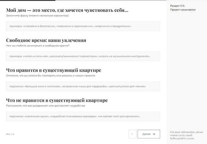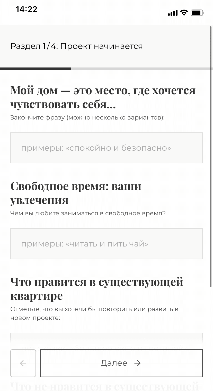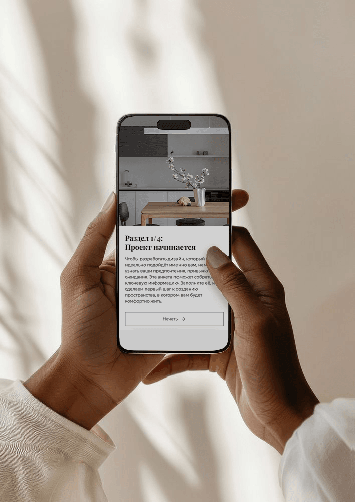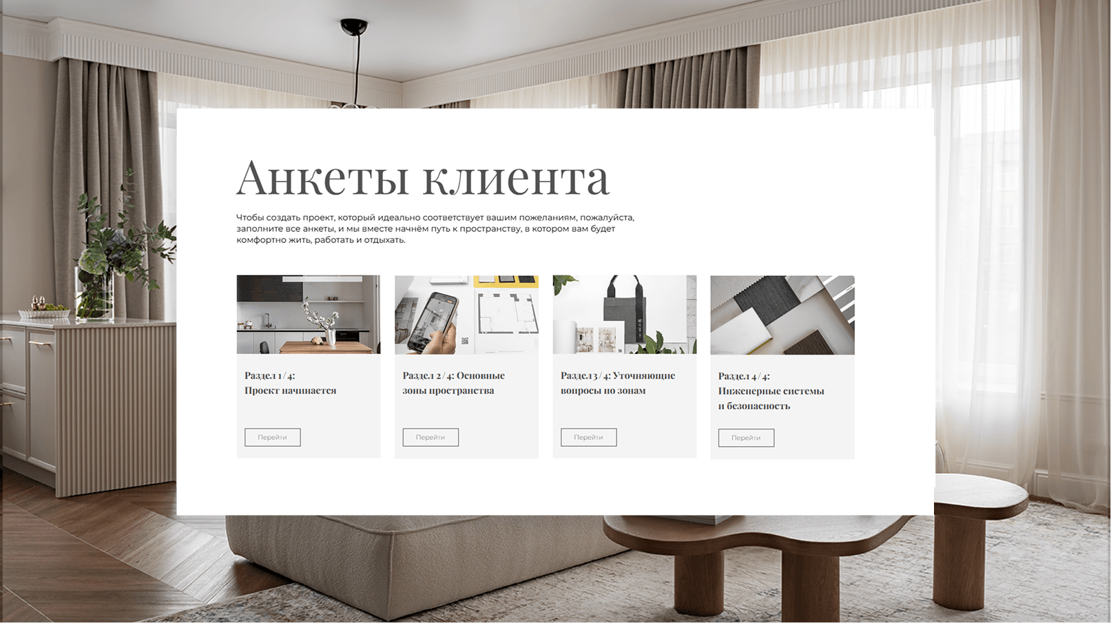 Ранее информация собиралась через Excel-таблицы, что было неудобно для клиентов и усложняло процесс обработки данных. Я переработала формат и создала структурированную анкету из 70+ вопросов, разбитых по логическим блокам (предпочтения, стиль, бюджет, функциональные требования и др.).